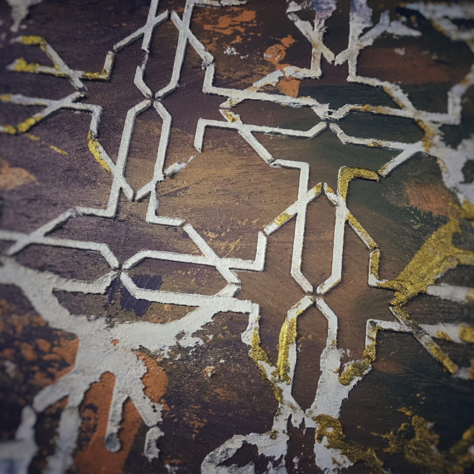 Этот трафарет идеально стыкуется в бесконечном раппорте, брутальный стиль, прекрасен для мужских работ с имитацией фактур железа, камня, окислов и ржавчины в стиле лофт.