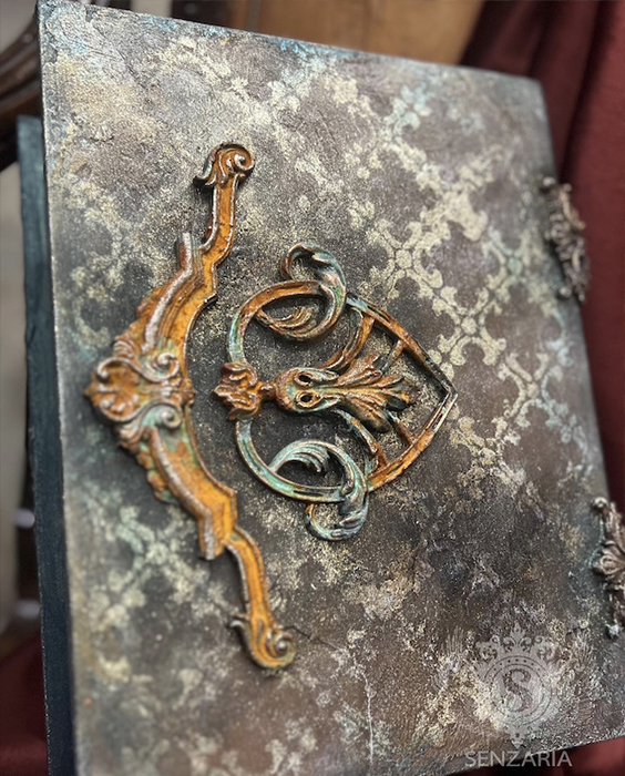 Орнамент трафарета даёт тонкий контурный рисунок сетки и при нанесении пасты смотрится, как выпуклая сетка. Особенно эффектно смотрится с поталью и металлизированными красками.